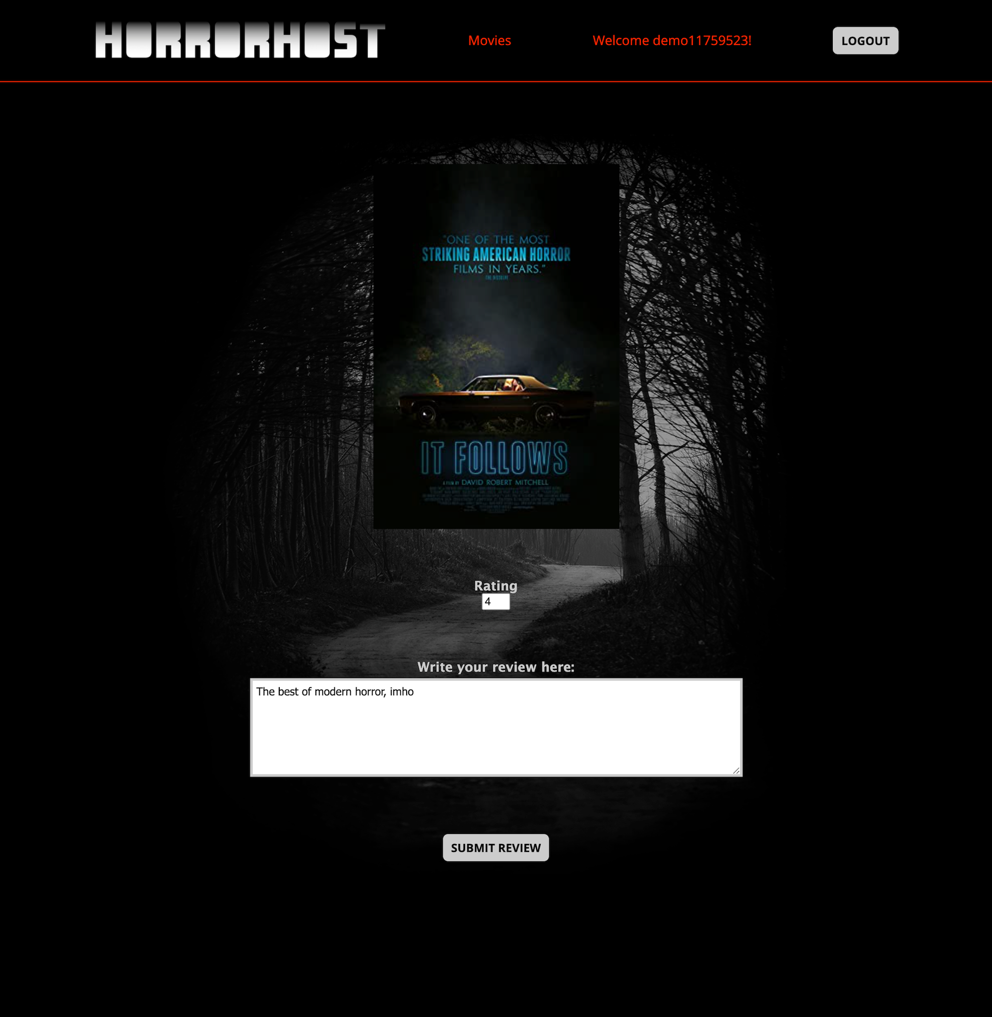 Users can add read about movies and add them to their playlist shelves, share reviews and ratings, and view all details from the database of frightful flicks.